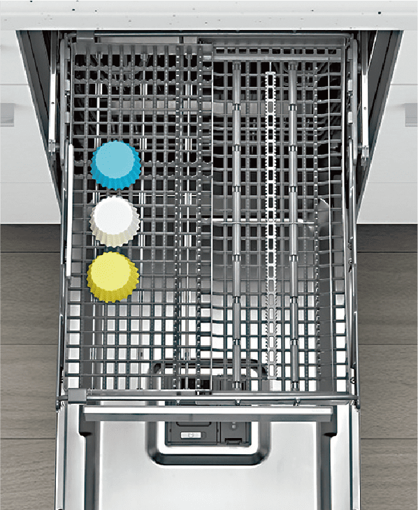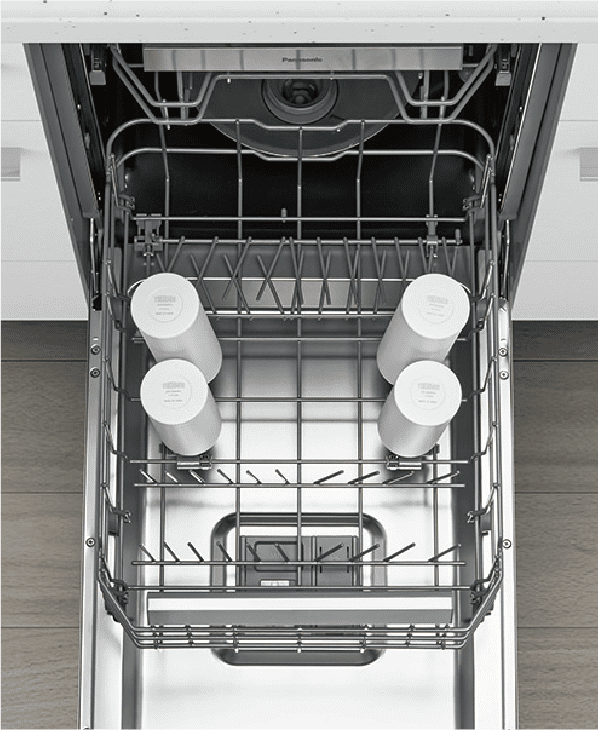 大皿のほか、ピンを折りたためば深鍋などもセット可能。ボトルホルダーには、長筒形状の食洗機対応マイボトルやタンブラーなどがセットでき、洗いにくい内側の底まで洗えます。