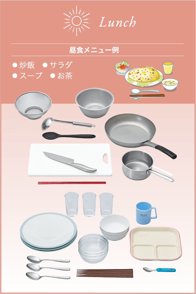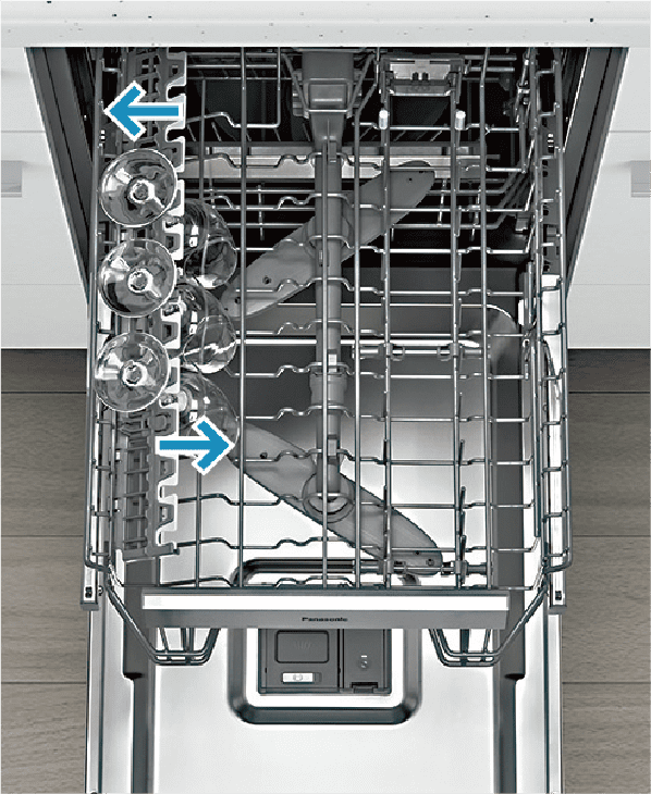 カトラリー以外にもお玉などの調理小物やシリコンカップなどがセット可能。また、上カゴに背の高いものをセットしたい場合には当たらないように、左側をスライドできます。