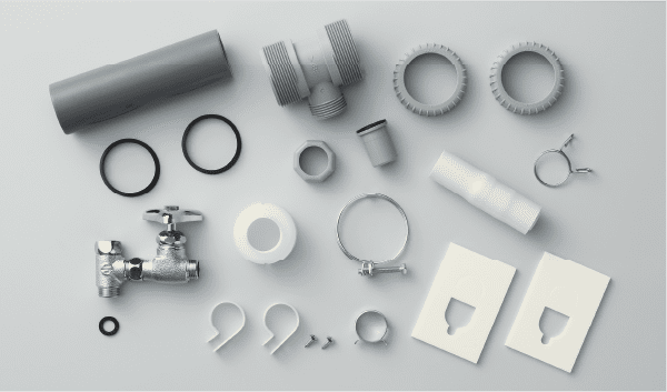パナソニック製のフロントオープン食器洗い乾燥機の給水・排水管をシンク下に設置する場合に必要な排水管接続部材および処理部材です。