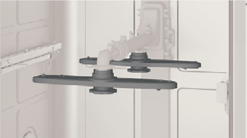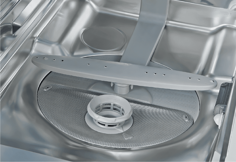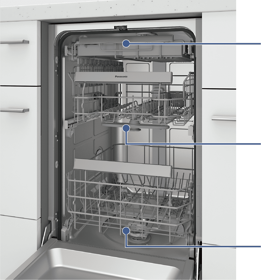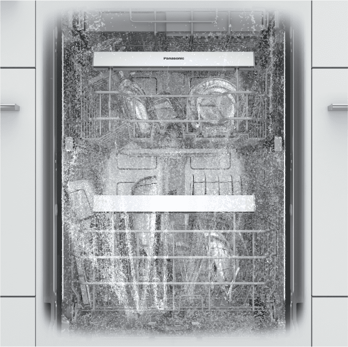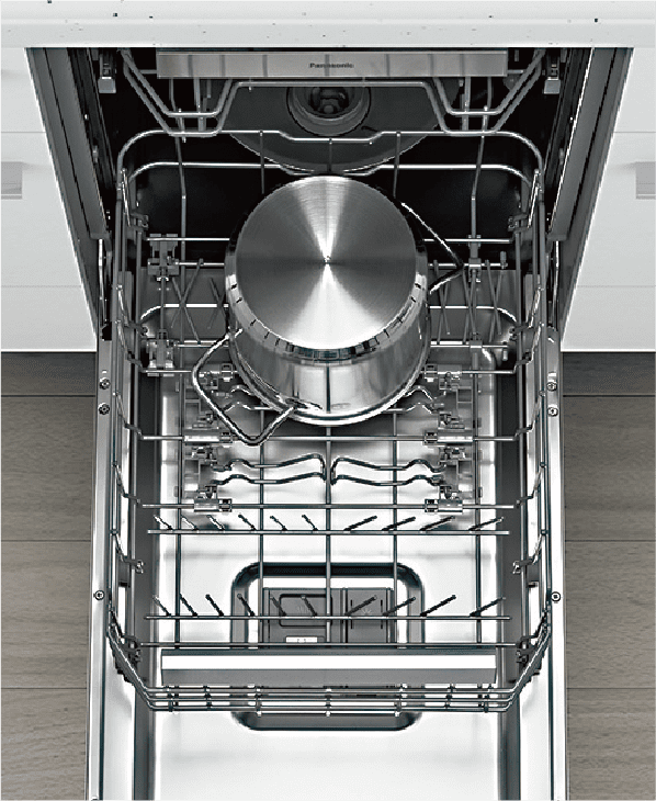 底面から強い水流を噴射し、下カゴにセットされた食器や調理器具、ボトルの底の汚れまでしっかり洗い流します(※5)。