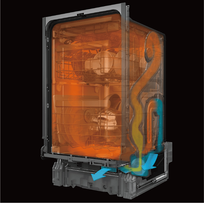 ケコミ排気乾燥システム洗浄後は、ヒーターで熱した温風をファンで庫内に送り込む「ヒーター乾燥」でカラッと乾燥。排気は足元の排気口から、約35 ℃※6の低温・低湿排気するケコミ排気乾燥システムです。