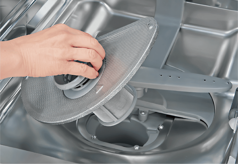 天面からシャワーのように洗浄水を噴射し、カトラリーなどを洗浄します。
