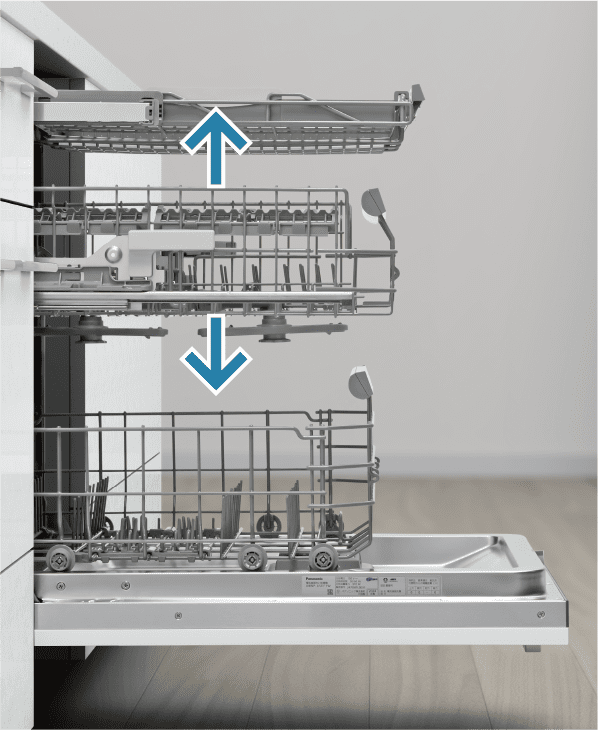 セットするものに応じて高さを3段階で調整可能。碗類やコップ類のほか、伸縮できるカップトレイにはワイングラスや弁当箱、小鉢などがセットでき、使わない時はたたむこともできます。