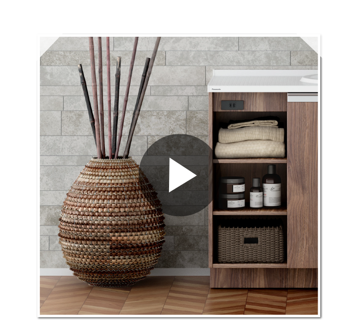丸い洗面ボールとタイル調テクスチャーのカウンターが個性を演出。