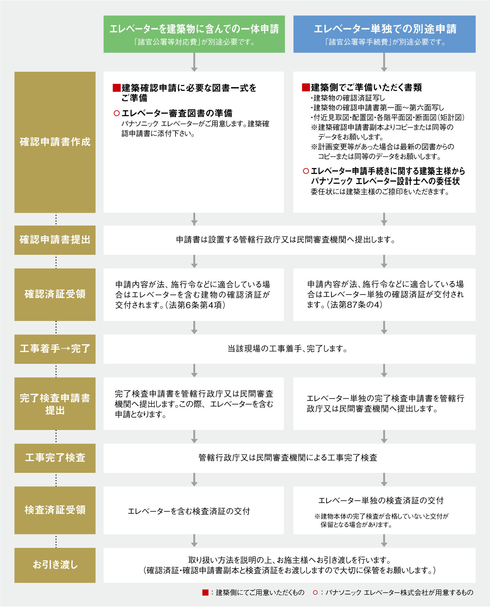 エレベーターの使用開始時には、エレベーターの検査済証が必要です。もし建物の検査済証が発行されていない場合、建築設備としてのエレベーターの検査済証も発行されません。スムーズにエレベーターを使用していただくために、必ず建物の確認申請を行い、竣工検査を受けてください。