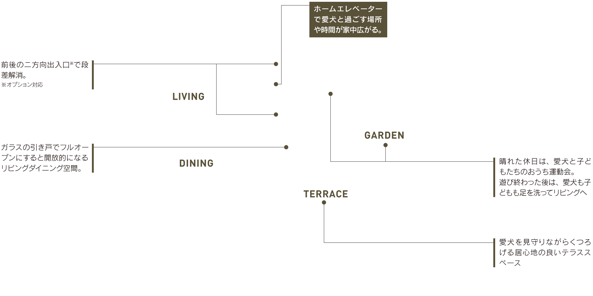 ホームエレベーターがあれば安全に階の移動ができ、愛犬と一緒に過ごす場所や時間が広がります。