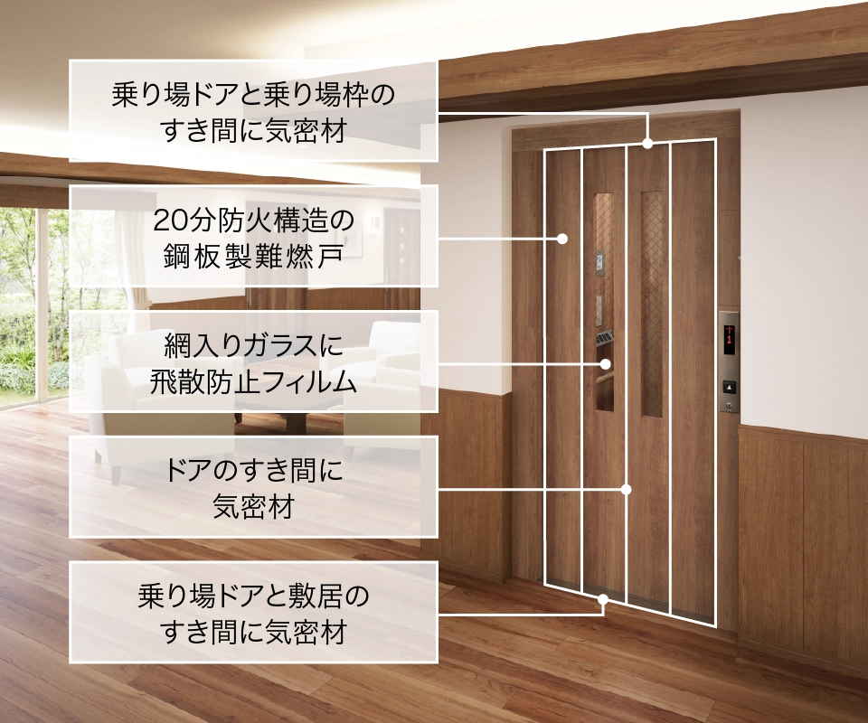 エレベーター乗り場ドアそのものに遮煙性能を持たせることで、標準寸法と同スペースで設置ができ設計の自由度がアップ。これまで別途必要だった建築側での防火設備工事が不要となります。