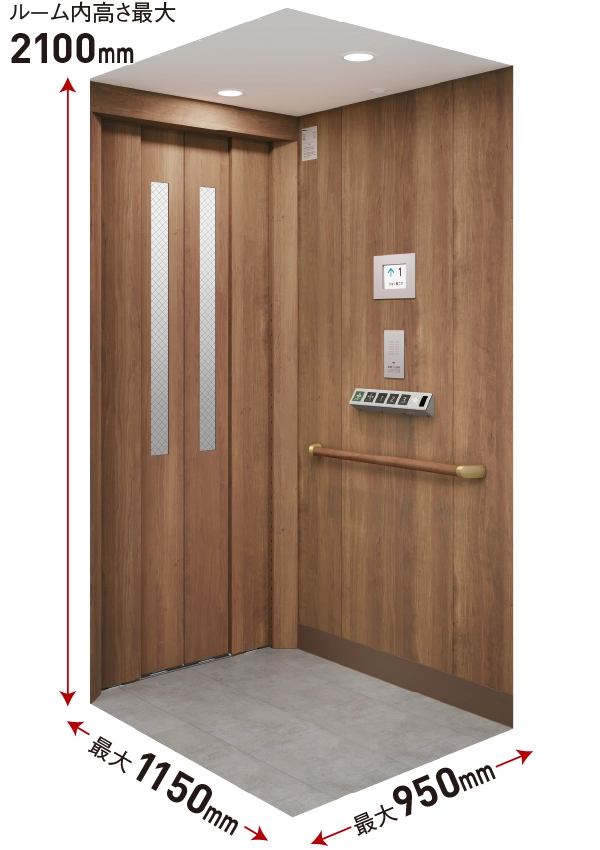 ルーム内高さ最大2100mm、ルーム内間口最大950mm、ルーム内奥行き最大1150mm。広い空間は乗る人がリラックスでき、快適に利用いただけます。