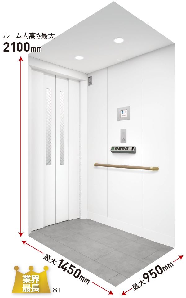 ルーム内高さ最大2100mm、ルーム内間口最大950mm、ルーム内奥行き業界最長(※1)最大1450mm。広い空間は乗る人がリラックスでき、快適に利用いただけます。