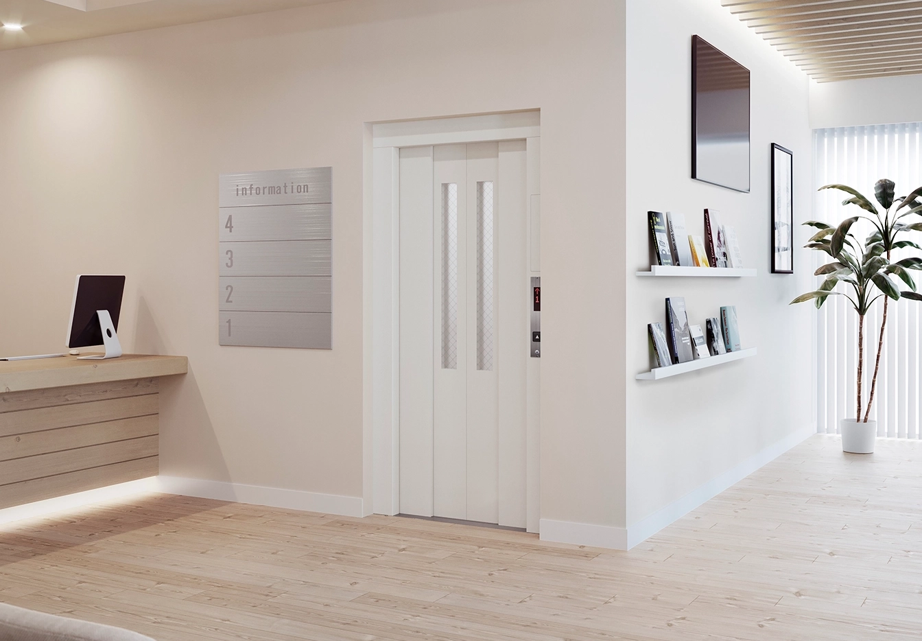 エレベーターの行先方向に応じて乗り合いする乗合全自動運転方式を採用。業務用エレベーターと変わらない操作性を実現し、小規模建築物での利便性が向上しました。