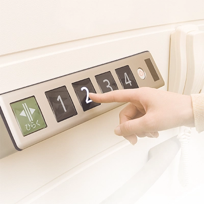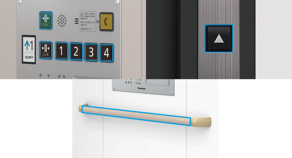 業界最大※のルーム内大型操作ボタンなので手の甲や肘でも押すことができます。また、液晶パネルで昇降方向や階数を表示。地震発生時※など、管制運転をメッセージでご案内します。