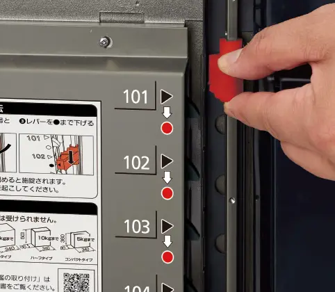 ③赤のレバーを受取人の部屋番号に押し下げてセットし、扉を閉めれば施錠状態になります。