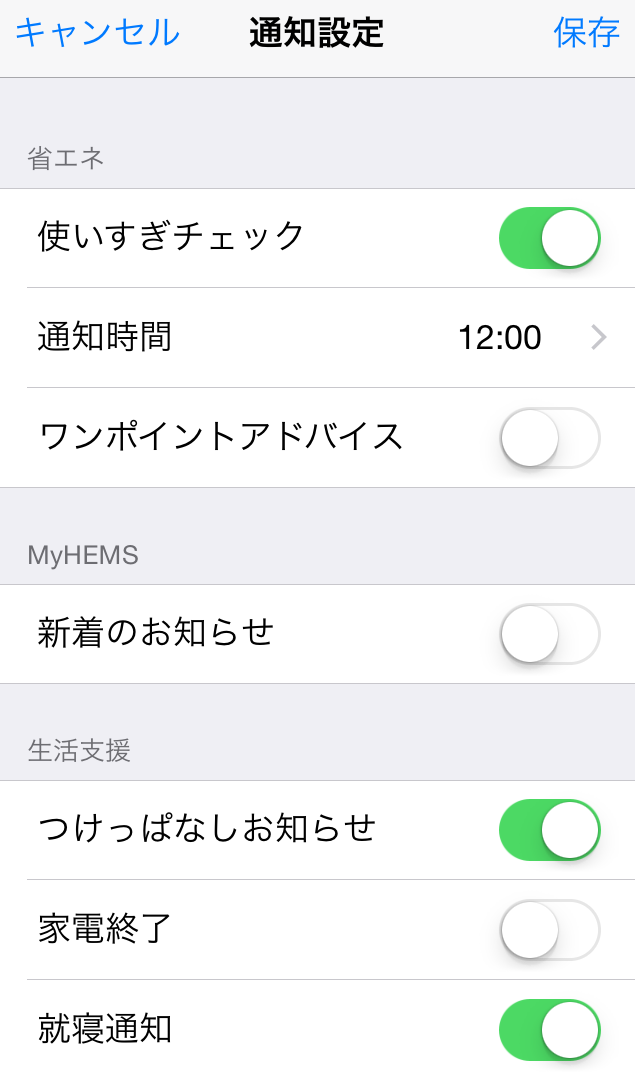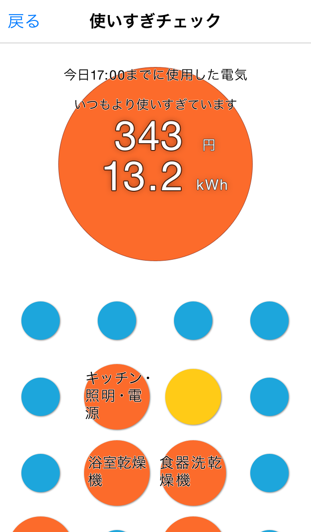 「省エネ」トップ画面にある「使いすぎチェック」を選択すると、家全体(上部の大きな丸)、および各分岐回路(下部の小さな丸)の電気使用状況が表示されます。