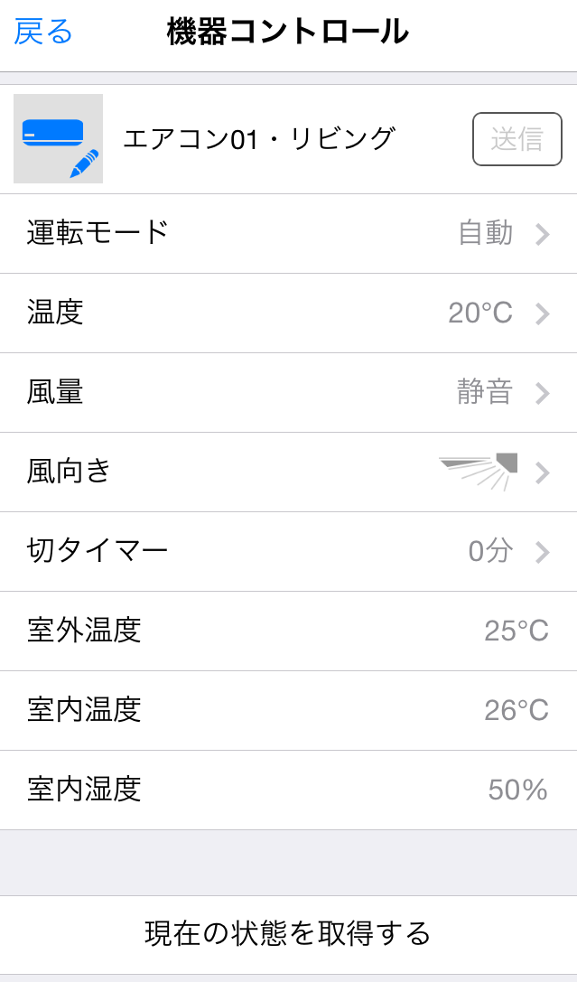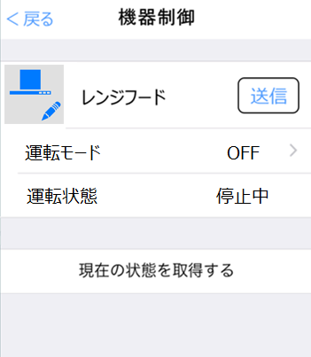 ※機器をタップすると操作画面が表示され、画面下部の「現在の状態を取得する」の表示部分をタップすると、各機器の現在の運転状態を更新します。