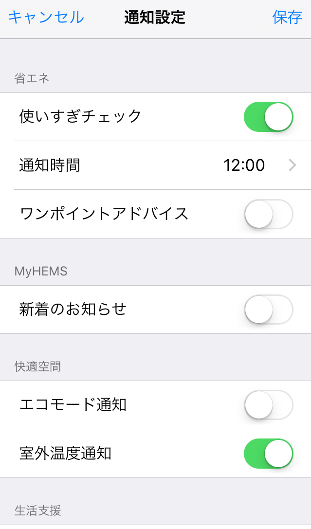 本サービスからお客様に送信されるプッシュ通知ON/OFFの設定、使いすぎチェックの通知時間設定を行います。