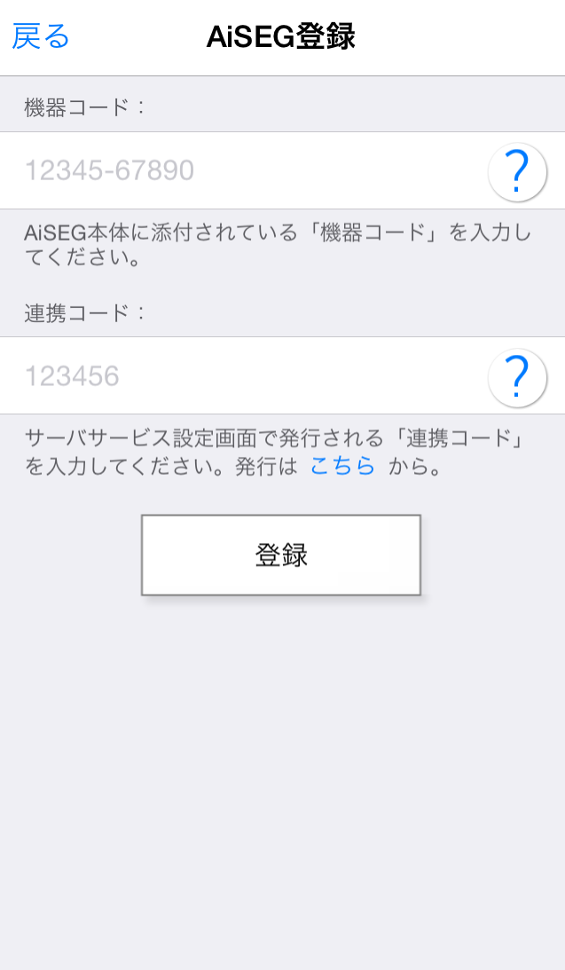 メニューからAiSEG登録を選択し、利用規約に同意していただくと下記画面に遷移します。