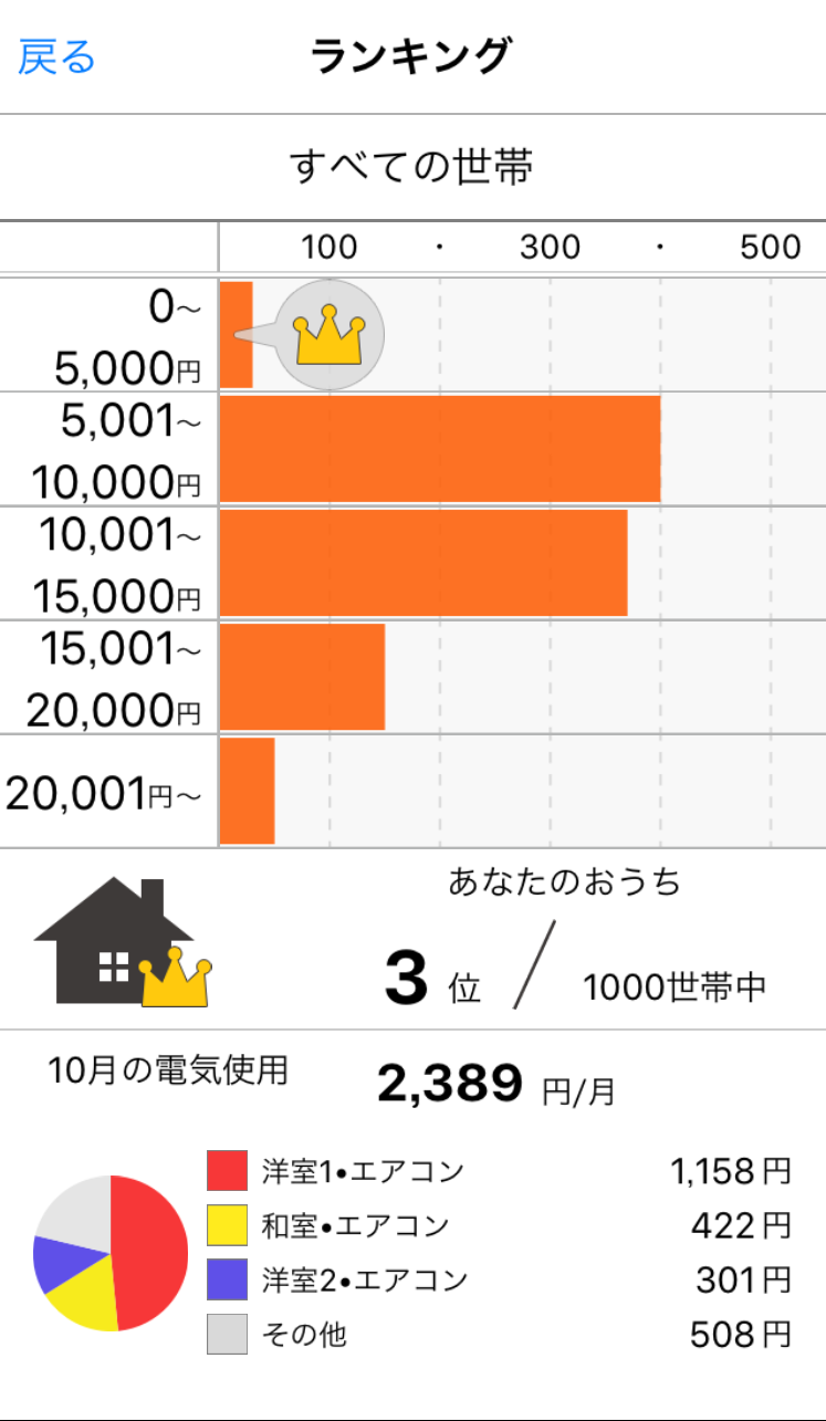 ランキングは「スマートHEMSサービス」に登録されている世帯様の中でオール電化、ガス併用住宅などの利用エネルギー別に、先月1ヵ月間の電気料金の順位を表示します。所属する分布には「家マーク」を表示し、さらに上位5%以内に入っている場合は「王冠マーク」が表示されます。