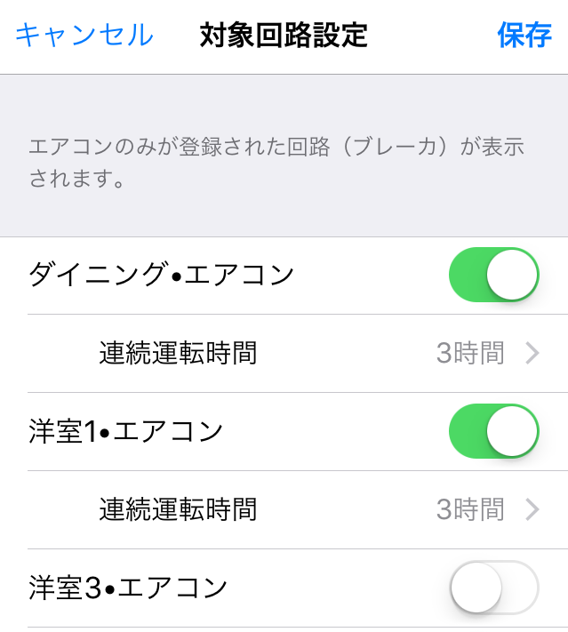 - 対象回路設定で、見守り対象とするエアコンのボタンをスライドさせ、緑色を表示させます。