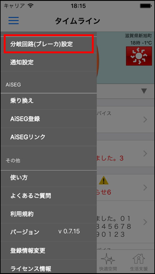 洗濯機が接続されている分岐回路(ブレーカ)が選択されていない場合は、下記のような画面が表示されます。 その場合は、メニューボタンより、分岐回路(ブレーカ)設定をしてください。