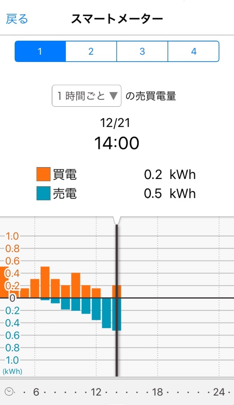 - グラフ部分をフリックすることで、過去の買電量と売電量を見ることができます。