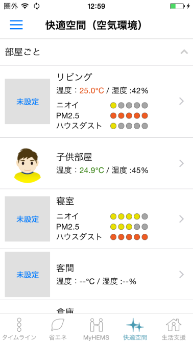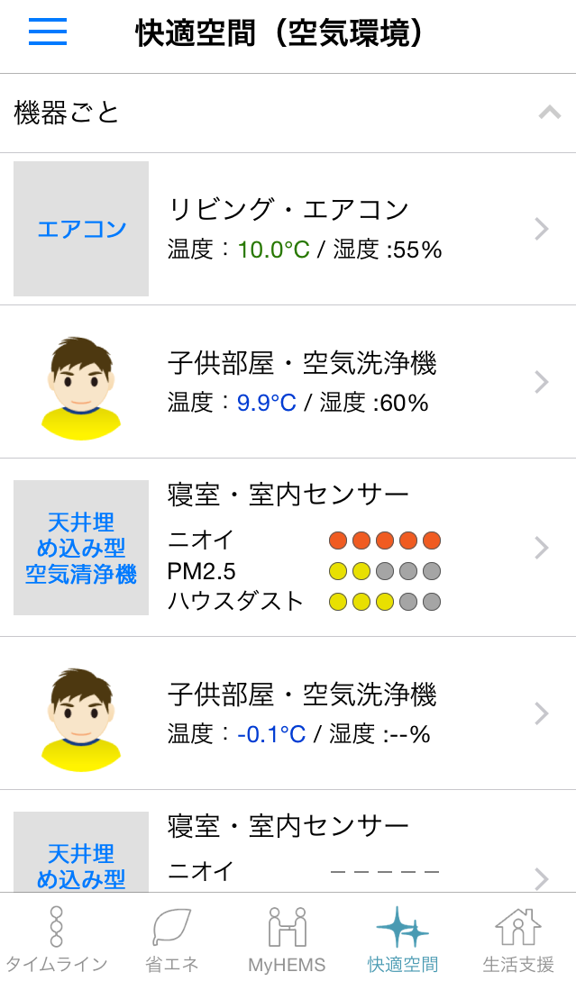 部屋ごと、または、機器ごとに、お部屋の空気環境を確認できます。