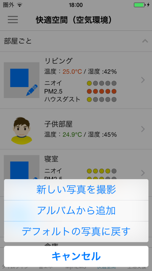 快適空間TOPの部屋、機器のアイコンは変更することができます。アイコン画像をタップすると、別画像を設定する画面が表示されます。