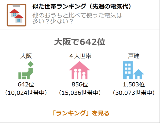 似た世帯における、先週1週間の電気代の順位を表示します。