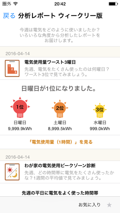 先週、電気をよく使った3曜日と電気使用量を表示し、どの曜日によく使ったかがわかります。