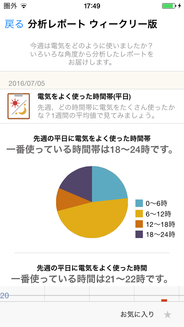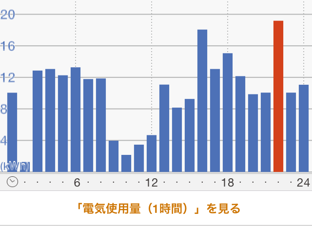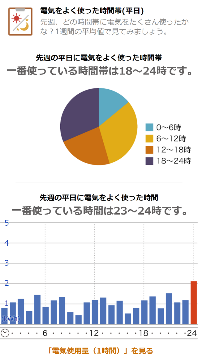 先週の月〜金曜日に電気をよく使った時間帯が2種類で表示され、どの時間によく使ったかがわかります。