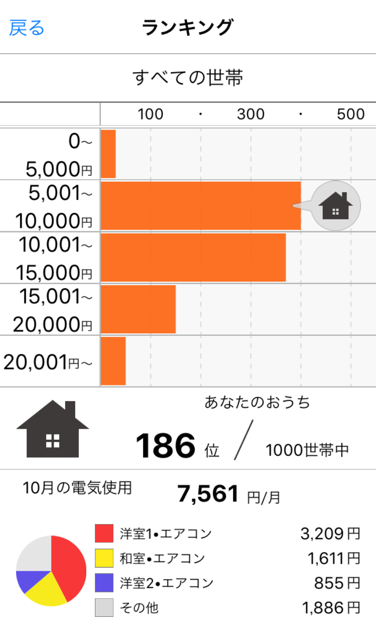 「省エネ」トップ画面にある「ランキング」を選択することで、ご自宅の電気料金ランキングが表示されます。