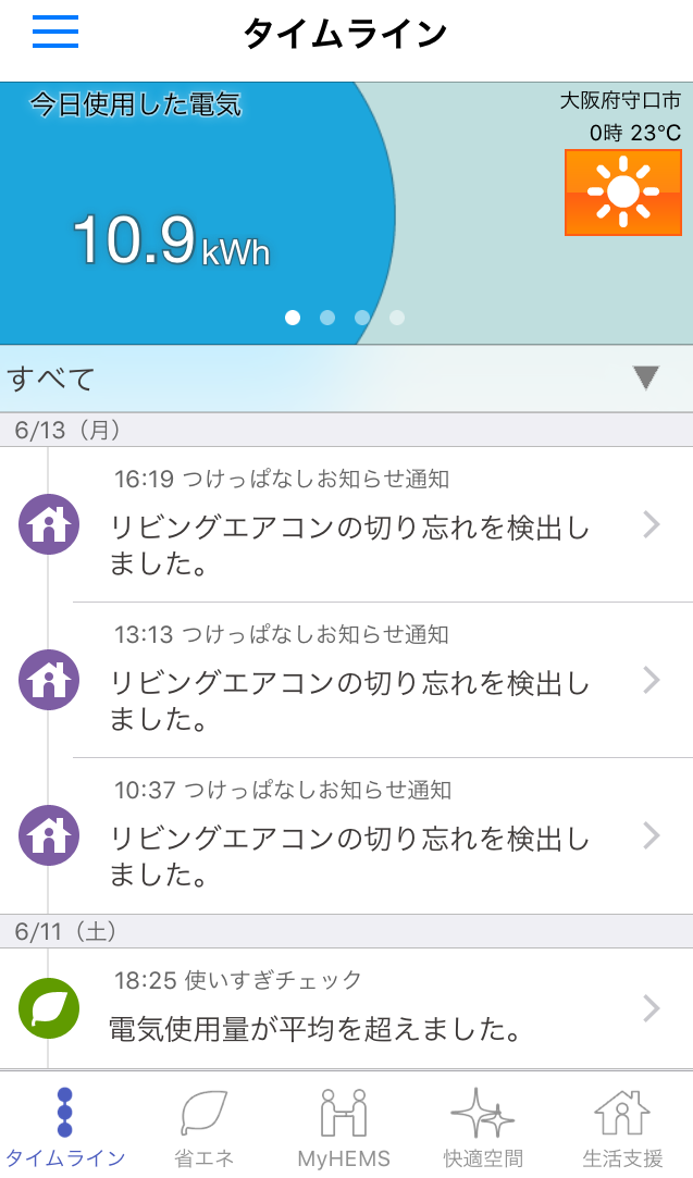 ご自宅に設置されたAiSEGからの電気使用情報が取得できていない場合に通知が届きます。通常は検知後すぐに送信しますが、夜間(21時〜7時)に検知した場合は翌朝7時以降に送信します。