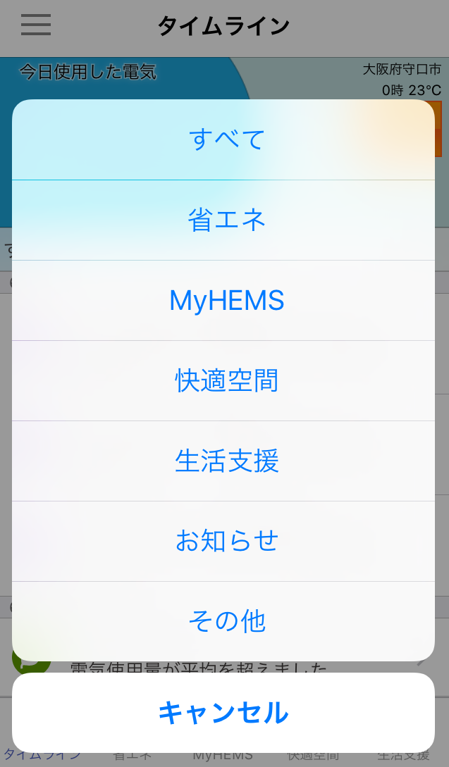 通知設定画面では「使いすぎチェック」のプッシュ通知の有効・無効の切り替えと、有効の場合の通知時間の設定、「ワンポイントアドバイス」の有効・無効の設定ができます。 - タイムラインのメッセージは「すべて」、各サービス、「お知らせ」、「その他」のカテゴリーを選択して表示することが可能です。