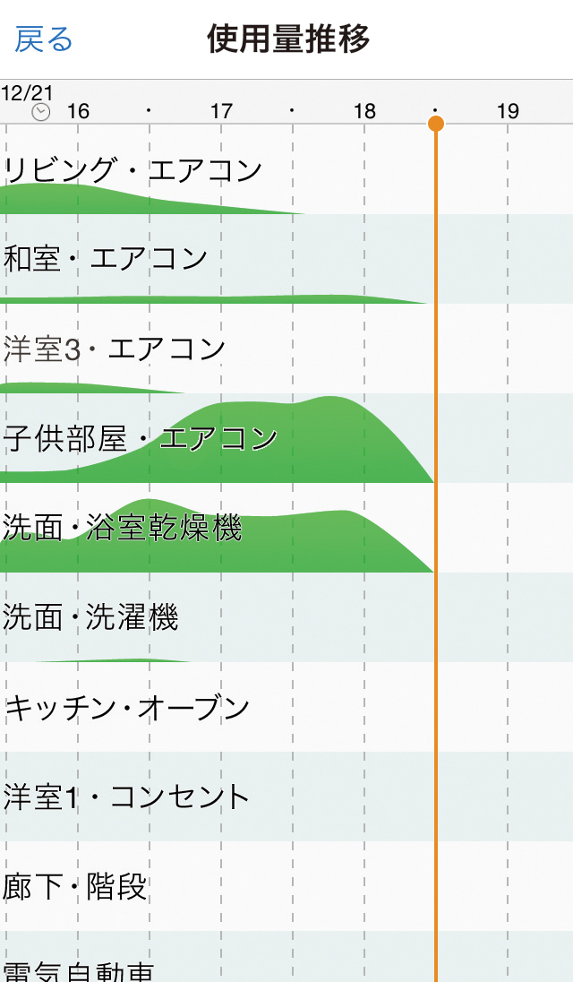 「省エネ」トップ画面にある「使用量推移」ボタンを選択することで、分岐回路ごとの電気使用量の時間推移がグラフで表示されます。