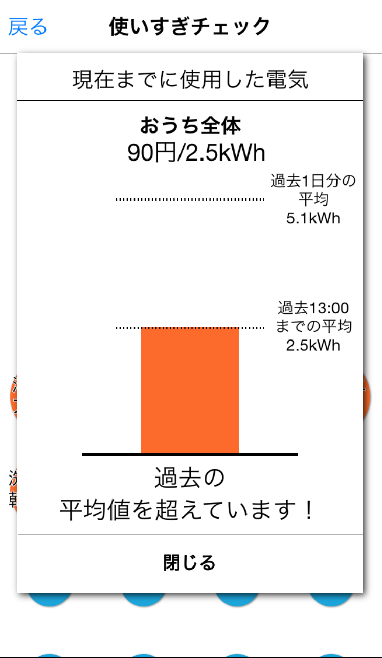 「省エネ」トップ画面にある「使いすぎチェック」を選択すると、家全体(上部の大きな丸)、および各分岐回路(下部の小さな丸)の電気使用状況が表示されます。