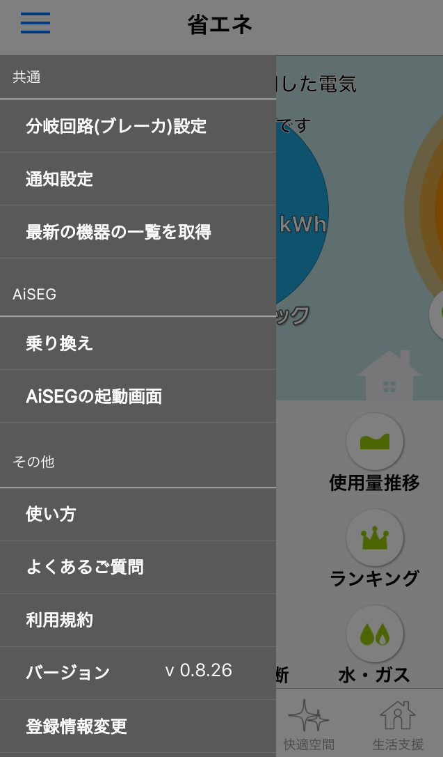 「省エネ」トップ画面にある「使いすぎチェック」を選択すると、家全体(上部の大きな丸)、および各分岐回路(下部の小さな丸)の電気使用状況が表示されます。