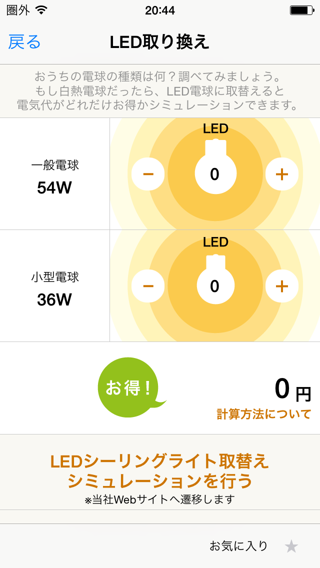 - シミュレーションは、2種類の電球で行うことができ、各電球の取替え個数を「+」または「−」で入力することで、1年間における電気代の削減額の目安を表示します。