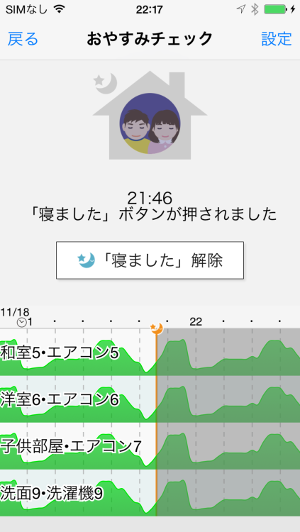 - 6:00〜18:00までの間は、前日に「寝ました」ボタンが押された場合にかぎり、押された時刻が表示されます。「寝ました」ボタンは18時〜翌朝6時の間で表示されます。