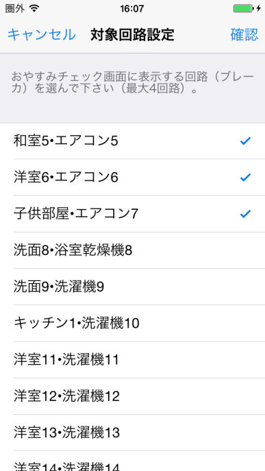 - 「おやすみチェック」画面に表示する分岐回路(最大4回路)を選択した後、確認ボタンをタップします。