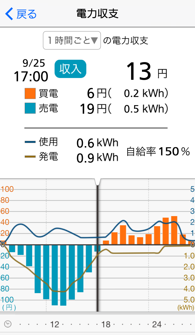 - グラフ部分をフリックすることで、過去の電力収支を見ることができます。