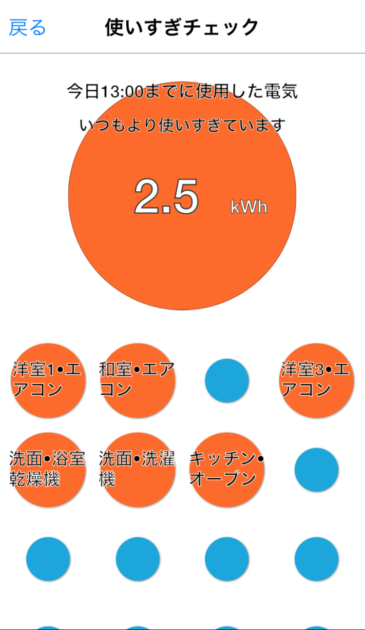 「省エネ」トップ画面にある「使いすぎチェック」を選択すると、家全体(上部の大きな丸)、および各分岐回路(下部の小さな丸)の電気使用状況が表示されます。