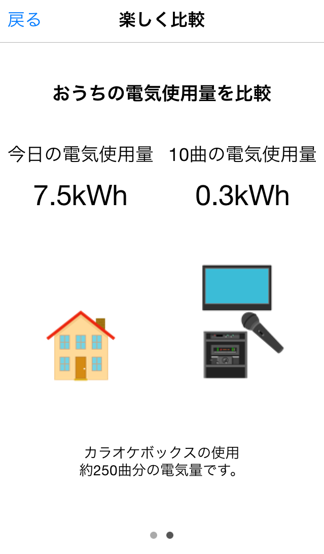 - 「楽しく比較」の画面で左右にフリックすると、過去のご自宅の電気使用量と比較する画面や、いろいろな施設や機器の電気使用量と比較する画面が表示されます。