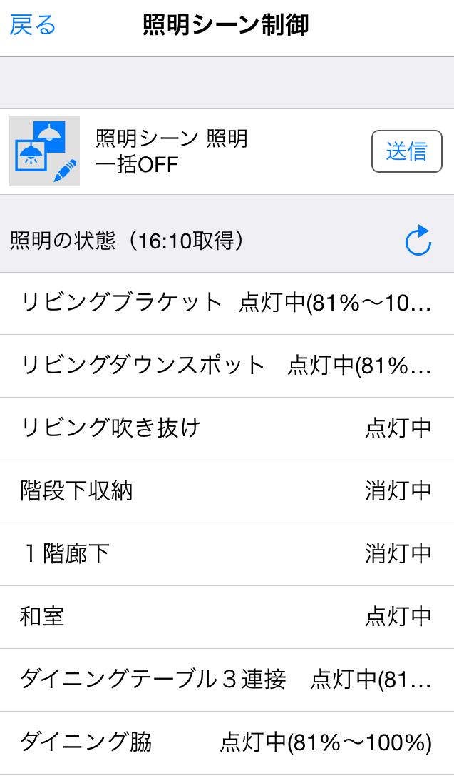 - 送信ボタンをタップするとシーン制御の信号を宅内に送信します。