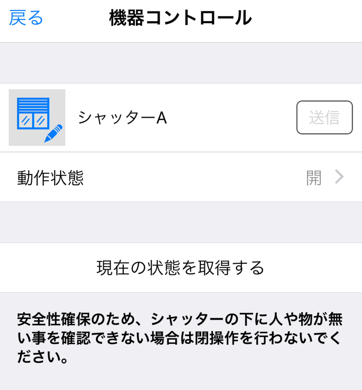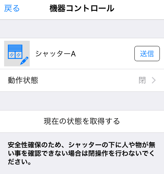 - 送信ボタンがタップ可能になるので、「送信」をタップすると、閉める設定が、電動窓シャッターに送信されます。