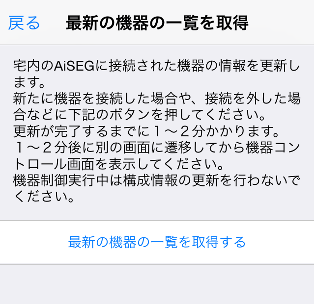 宅内のAiSEGに接続された機器の情報を更新することができます。新たな機器を接続した場合や、接続を外した場合は、機器の情報を更新してください。