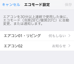 エアコンを30分以上連続で使用した後に、エコモードに自動変更するか、または、通知するもしくは何もしないかの設定を行います。
