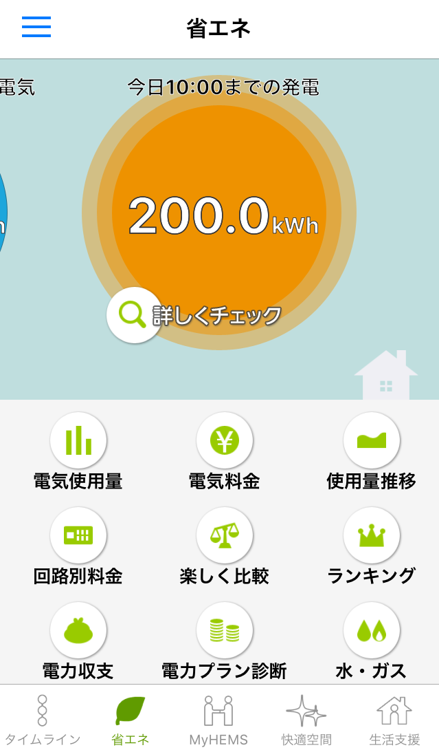 本日 0:00 から取得可能な最新の時間までの、電気使用量、発電量が表示されます。
