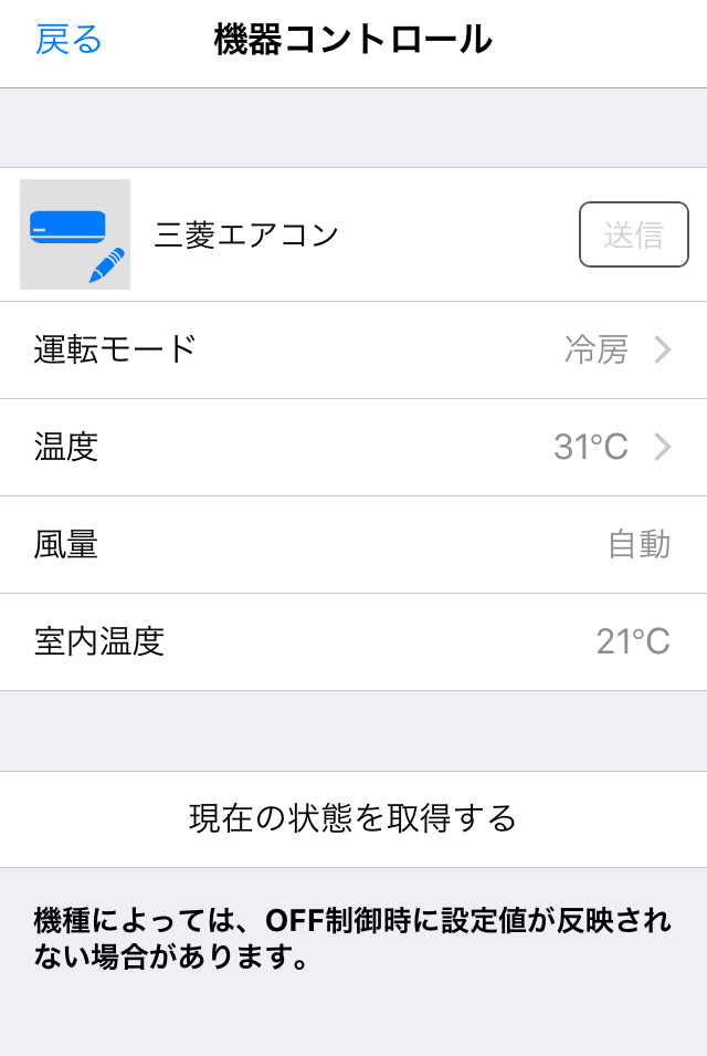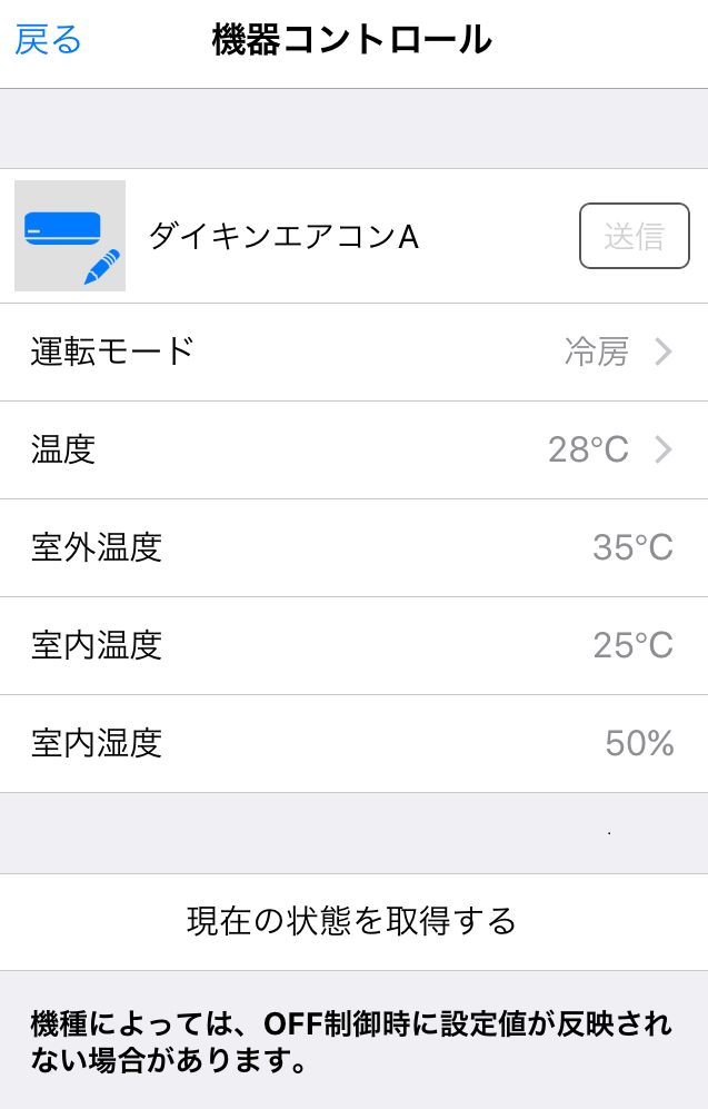 - 設定変更後、送信ボタンがタップ可能になるので、「送信」をタップすると、設定内容がエアコンに送信されます。