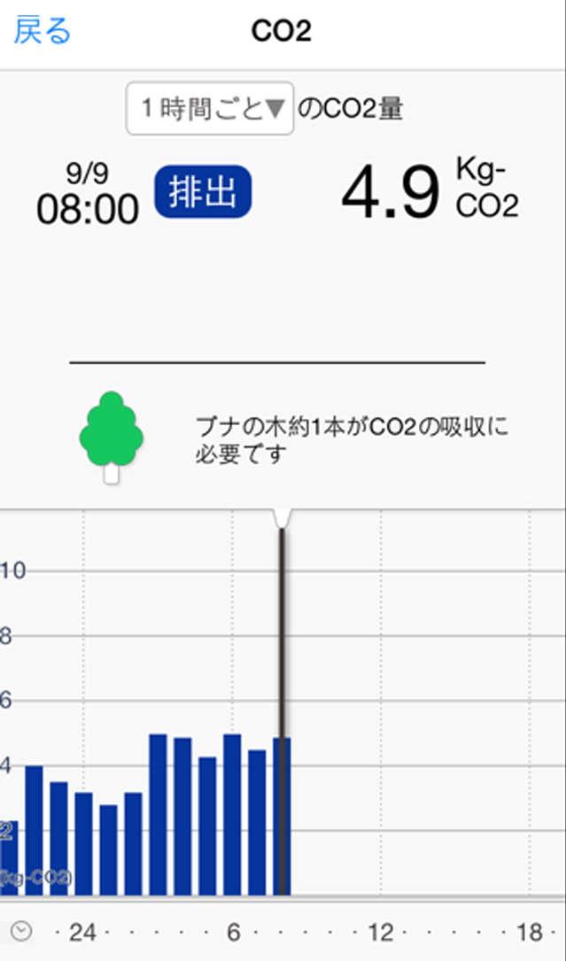 「省エネ」トップ画面にある「CO2」ボタンを選択することで、CO2排出量の時間推移がグラフで表示されます。