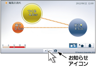 • (注)ファームウェアに関する更新があった場合、お知らせランプが赤色点灯します。また、電気の流れ画面あるいはエコ育画面で メニュー の右横に「お知らせアイコン」 (i)のアイコン が表示されます。