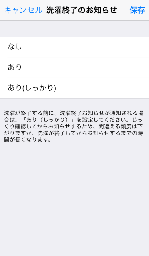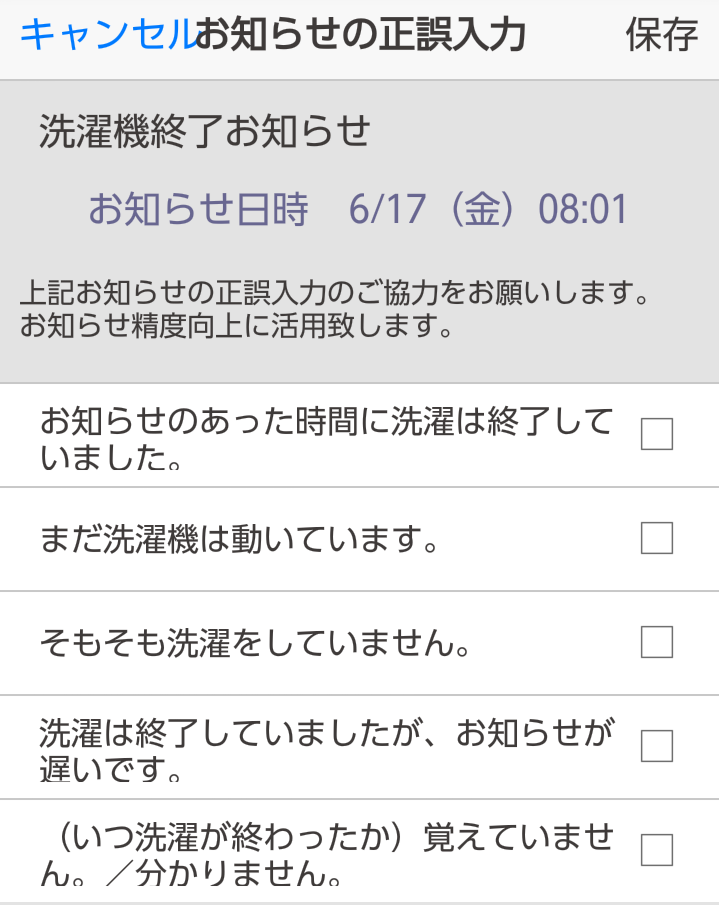 タイムラインに表示される洗濯機終了のメッセージをタップすると、お知らせの正誤入力の画面になります。